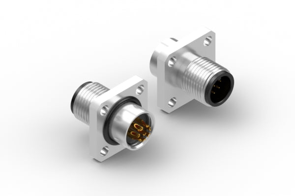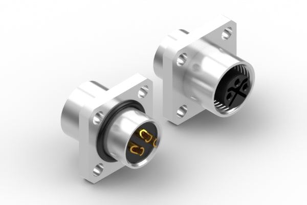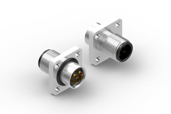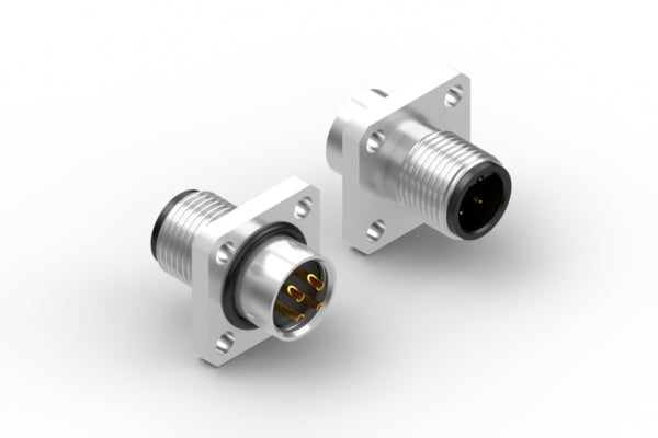 Connector, M12 B-code plug, 4 pin, 12xL23.5 mm, flange mount, solder cup, gold plated, IP67, shielded
