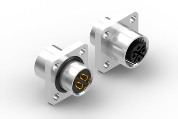 Connector, M12 T-code socket, 4 pin, 12xL22 mm, gold plated, flange mount, solder cup, IP67, shielded