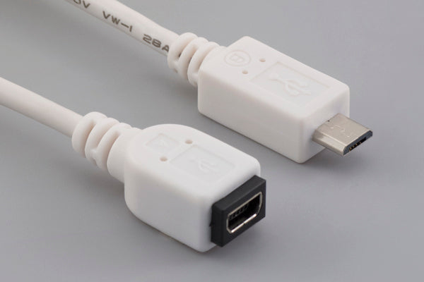 Cable, 100 mm, mini USB A receptacle to USB micro B male, 28 AWG, 30-00099 wire, white