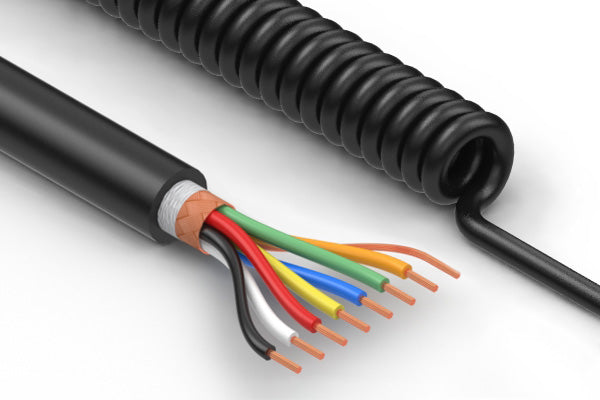 Coiled cable, 1115 mm, 7C blunt cut to same, 26 AWG, 5.2 mm, TPU, shielded, 30-00934 wire