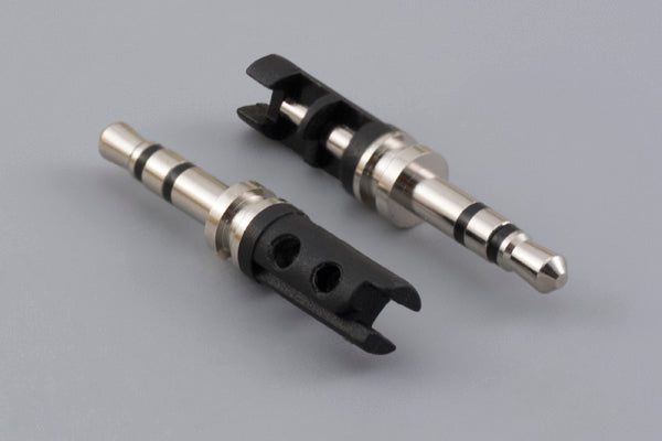 Connector, stereo plug, 2.5xL24 mm, brass, nickel plated, molding style