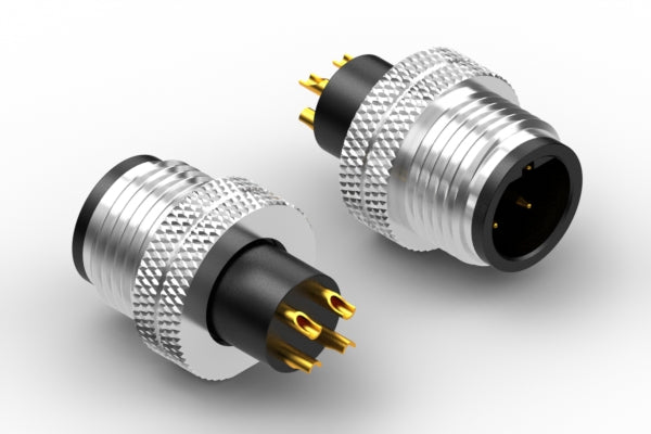 Connector, M12 B-code plug, 4 pin, 12xL22 mm, molding style, solder cup, gold plated, IP67
