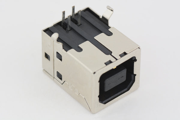 Connector, USB B jack, thru hole, 90°, board lock, nickel plated, shielded