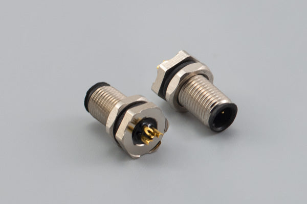 Connector, M5 A-code plug, 3 pin, 5xL13 mm, panel mount, solder cup, gold plated, IP67