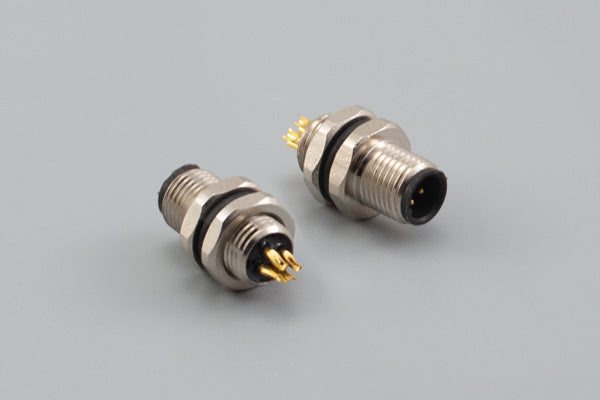 Connector, M5 A-code plug, 4 pin, 5xL13 mm, panel mount, solder cup, gold plated, IP67