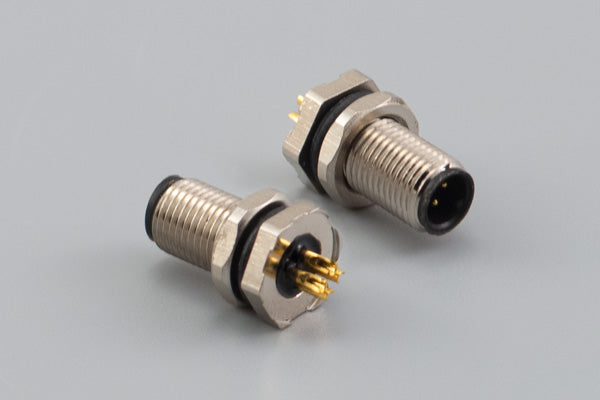 Connector, M5 A-code plug, 4 pin, 5xL13 mm, panel mount, solder cup, gold plated, IP67