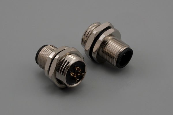 Connector, M12 A-code plug, 5 pin, 12xL24 mm, panel mount, solder cup, gold plated, IP67