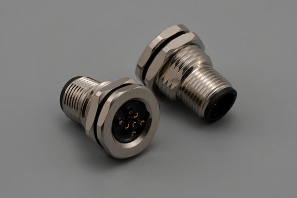 Connector, M12 A-code plug, 5 pin, 12xL24 mm, panel mount, solder cup, gold plated, IP67