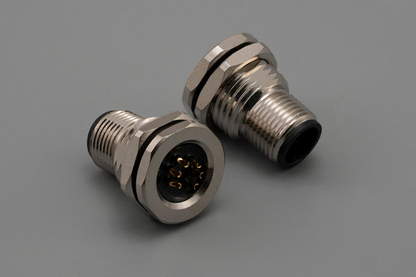 Connector, M12 A-code plug, 6 pin, 12xL24 mm, panel mount, solder cup, gold plated, IP67