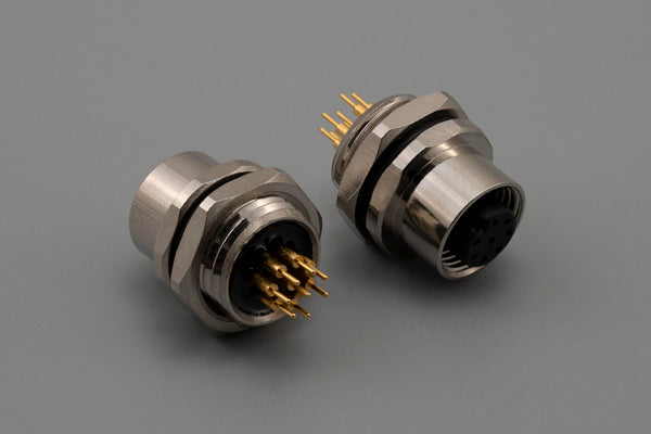 Connector, M12 A-code socket, 8 pin, 12xL26.2 mm, panel mount, thru hole, gold plated, IP67