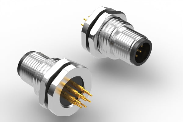Connector, M12 A-code plug, 8 pin, 12xL29.2 mm, panel mount, thru hole, gold plated, IP67