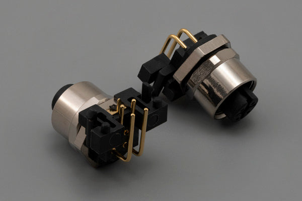 Connector, M12 A-code socket, 4 pin, 12xL25 mm, panel mount, thru hole, 90°, board lock, gold plated, IP67