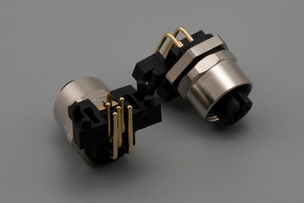 Connector, M12 A-code socket, 5 pin, 12xL25 mm, panel mount, thru hole, 90°, board lock, gold plated, IP67