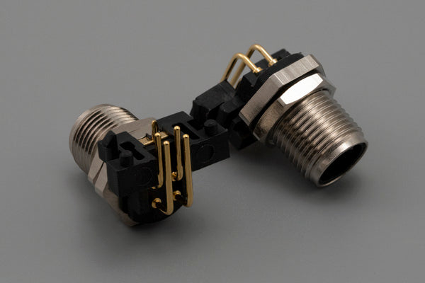 Connector, M12 A-code plug, 4 pin, 12xL24.3 mm, panel mount, thru hole, 90°, board lock, gold plated, IP67