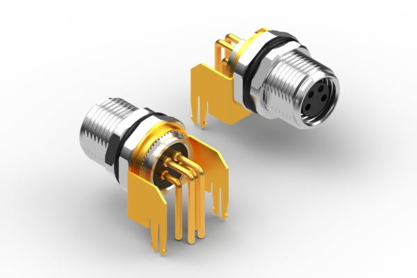 Connector, M8 A-code socket, 4 pin, 8xL20.6 mm, panel mount, thru hole, 90°, board lock, gold plated, IP67