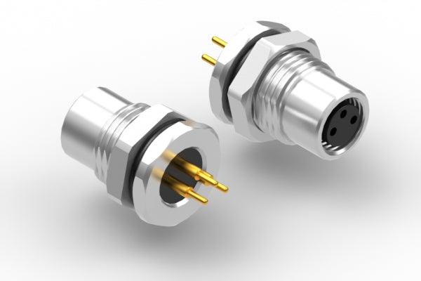 Connector, M8 A-code socket, 3 pin, 8xL22.4 mm, panel mount, thru hole, gold plated, IP67