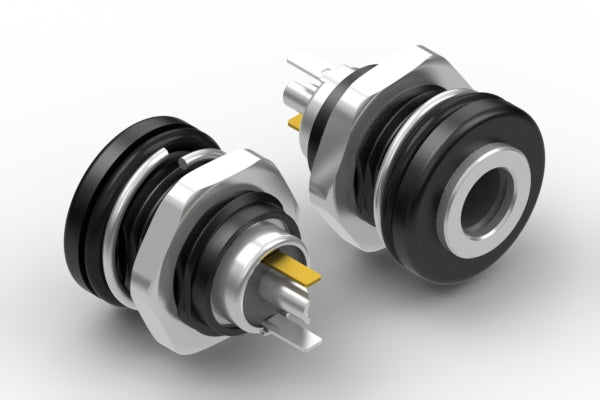 Connector, dc jack w/switch, 5.5x2.5xL22 mm, panel mount, nickel plated, IP67, threaded, nut and washer