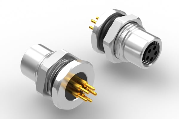 Connector, M8 B-code socket, 5 pin, 8xL22 mm, panel mount, thru hole, gold plated, IP67