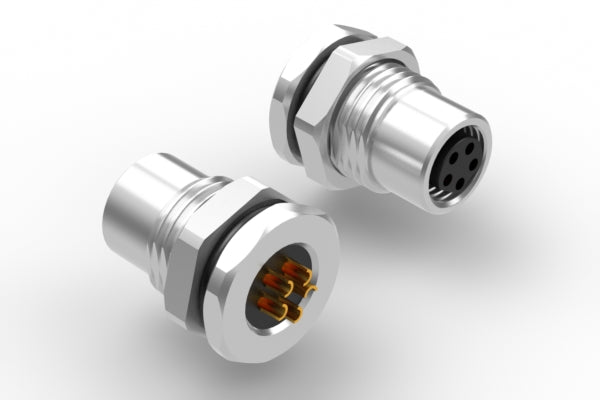 Connector, M8 B-code socket, 5 pin, 8xL18.7 mm, panel mount, solder cup, gold plated, IP67
