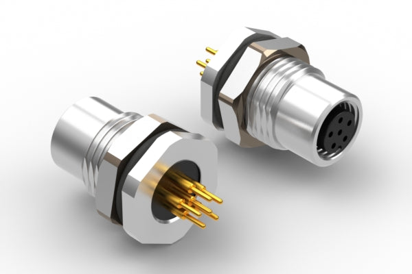 Connector, M8 A-code socket, 6 pin, 8xL22.3 mm, panel mount, thru hole, gold plated, IP67