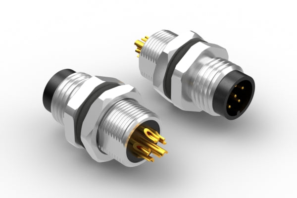 Connector, M8 A-code plug, 6 pin, 8xL20.6 mm, panel mount, solder cup, gold plated, IP67