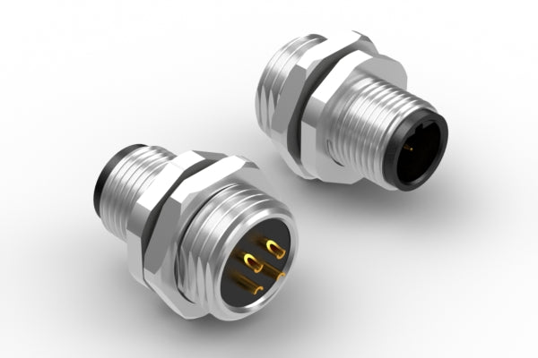 Connector, M12 B-code plug, 4 pin, 12xL24 mm, panel mount, solder cup, gold plated, IP67
