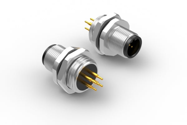 Connector, M12 B-code plug, 5 pin, 12xL29.2 mm, panel mount, thru hole, gold plated, IP67
