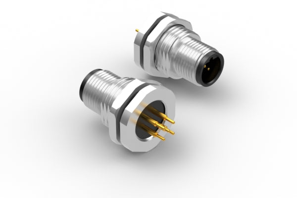 Connector, M12 B-code plug, 5 pin, 12xL29.2 mm, panel mount, thru hole, gold plated, IP67