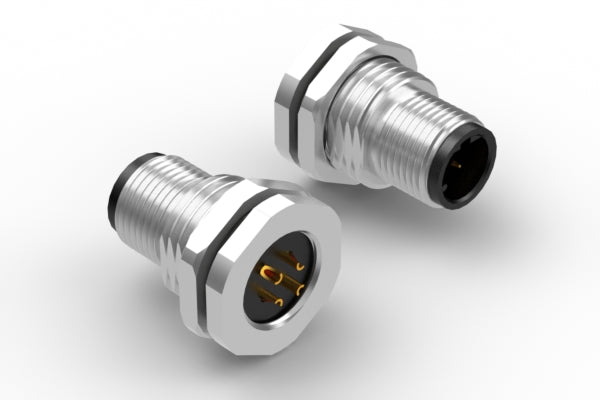 Connector, M12 D-code plug, 4 pin, 12xL24 mm, panel mount, solder cup, gold plated, IP67