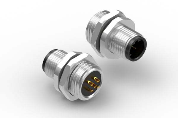 Connector, M12 D-code plug, 5 pin, 12xL24 mm, panel mount, solder cup, gold plated, IP67