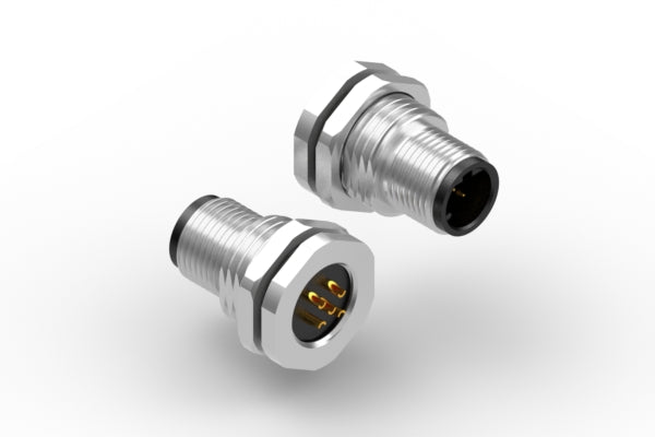 Connector, M12 D-code plug, 5 pin, 12xL24 mm, panel mount, solder cup, gold plated, IP67