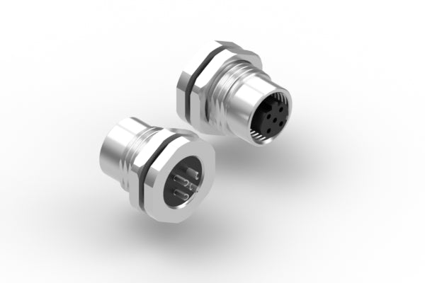 Connector, M12 D-code socket, 5 pin, 12xL21.6 mm, panel mount, solder cup, gold plated, IP67
