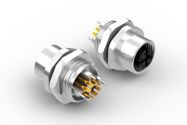 Connector, M12 X-code socket, 8 pin, 8xL25 mm, panel mount, solder cup, gold plated, IP67