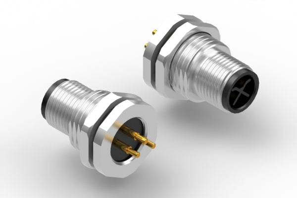 Connector, M12 S-code plug, 3 pin, 12xL22.7 mm, panel mount, thru hole, gold plated, IP67