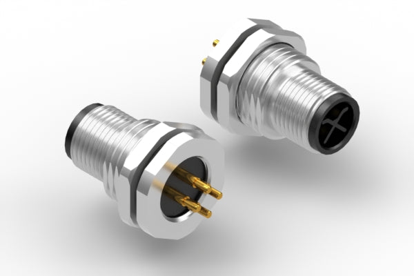 Connector, M12 S-code plug, 4 pin, 12xL22.7 mm, panel mount, thru hole, gold plated, IP67