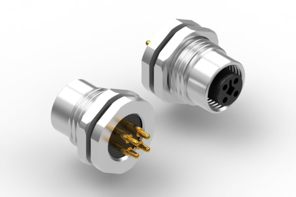 Connector, M12 T-code socket, 4 pin, 12xL19.7 mm, panel mount, thru hole, gold plated, IP67