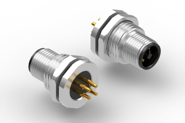 Connector, M12 T-code plug, 4 pin, 12xL22.7 mm, panel mount, thru hole, gold plated, IP67