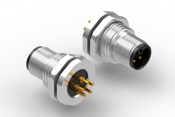 Connector, M12 L-code plug, 5 pin, 12xL22.7 mm, panel mount, thru hole, gold plated, IP67