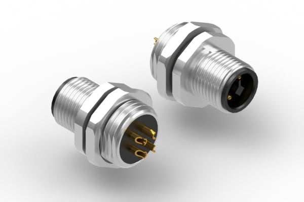 Connector, M12 T-code plug, 4 pin, 12xL25.5 mm, panel mount, solder cup, gold plated, IP67