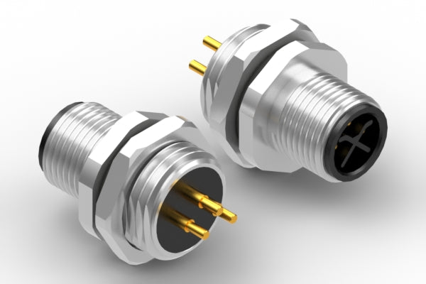Connector, M12 S-code plug, 3 pin, 12xL22 mm, panel mount, thru hole, gold plated, IP67