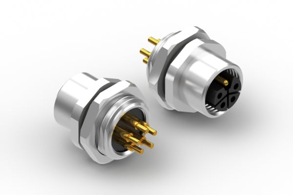 Connector, M12 L-code socket, 5 pin,12xL19.7 mm, panel mount, thru hole, gold plated, IP67