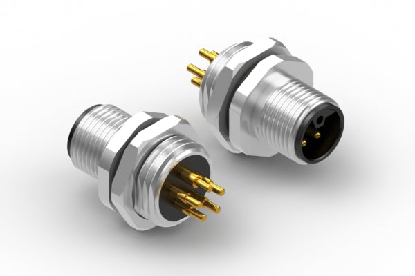 Connector, M12 L-code plug, 5 pin, 12xL22 mm, panel mount, thru hole, gold plated, IP67