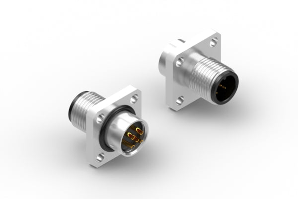 Connector, M12 A-code plug, 5 pin, 12xL23.5 mm, flange mount, solder cup, gold plated, IP67, shielded