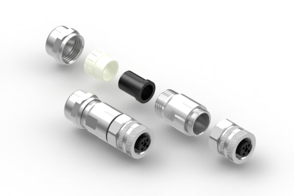 Connector, M12 T-code socket, 4 pin, 12xL50 mm, gold plated, assembly type, solder cup, IP67, shielded