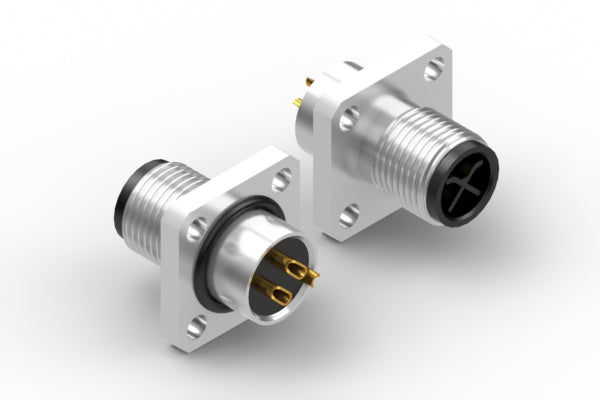 Connector, M12 S-code plug, 3 pin, 12xL25.8 mm, gold plated, flange mount, solder cup, IP67, shielded