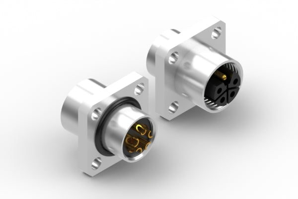 Connector, M12 L-code socket, 5 pin, 12xL22 mm, gold plated, flange mount, solder cup, IP67, shielded